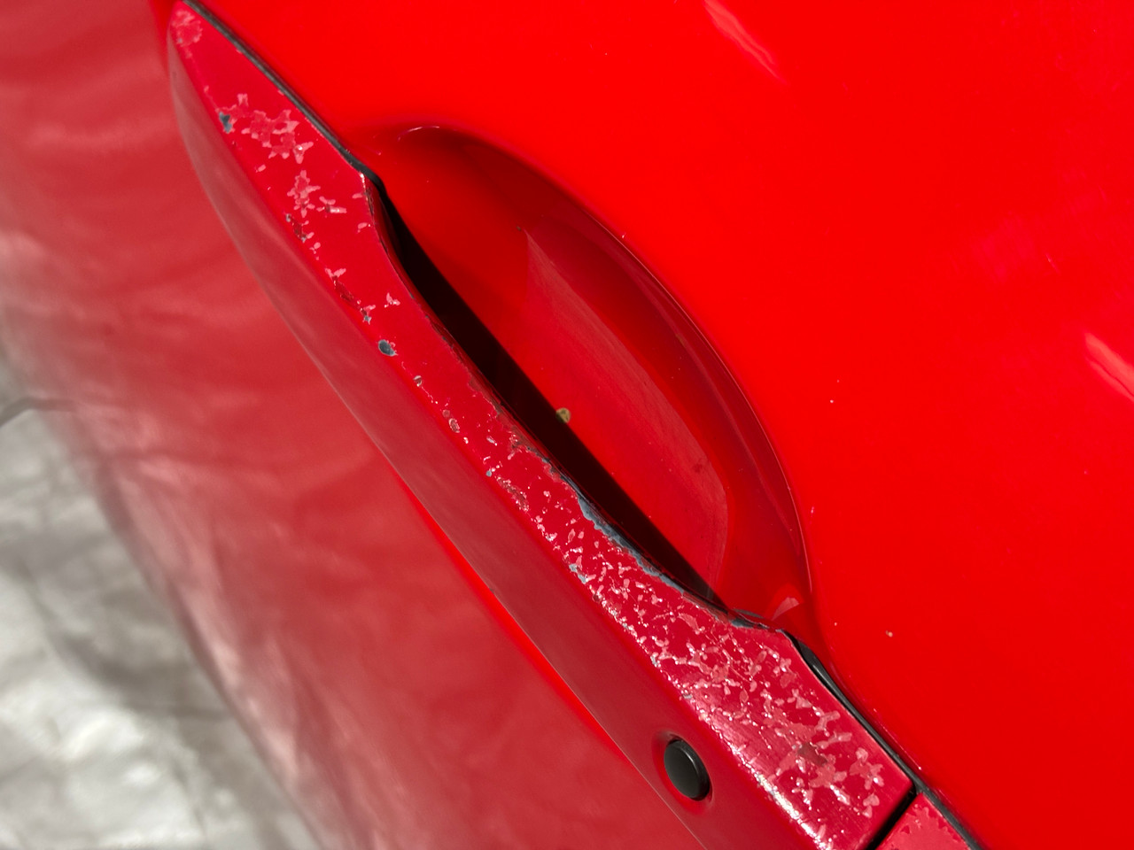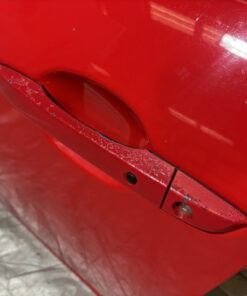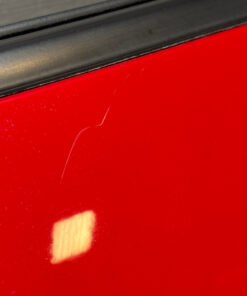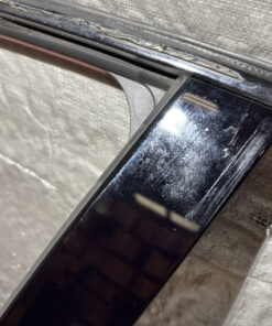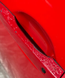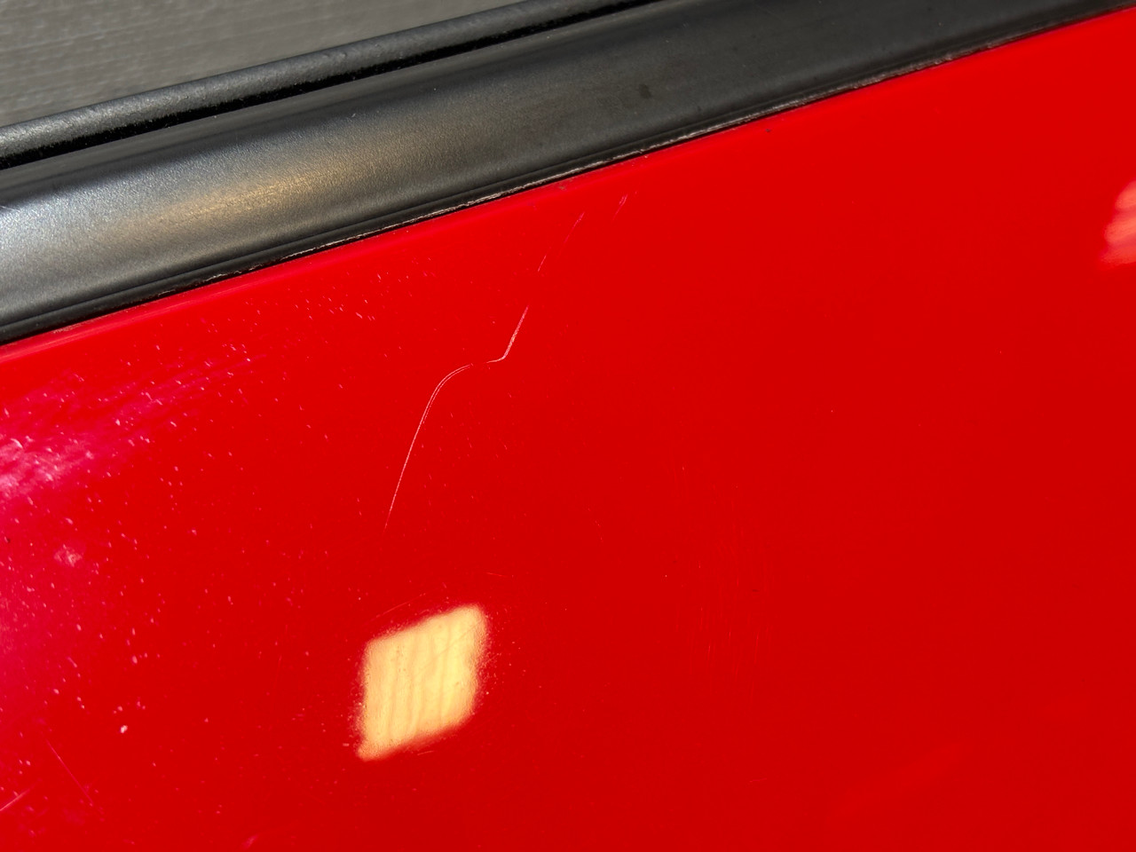 In typical used cosmetic condition with no deep scratches or major fading in the finish. The door frame has some heavier adhesive residue leftover from previously installed vent visors. There is some chips and scratches in the finish, some of which are poorly touched up. There are a few light scratches and swirls in the finish which may not be directly visible in the photos. The paint finish on the exterior door handle has heavier sun damage and bubbling in the finish as shown.