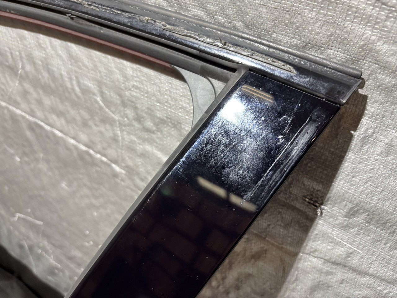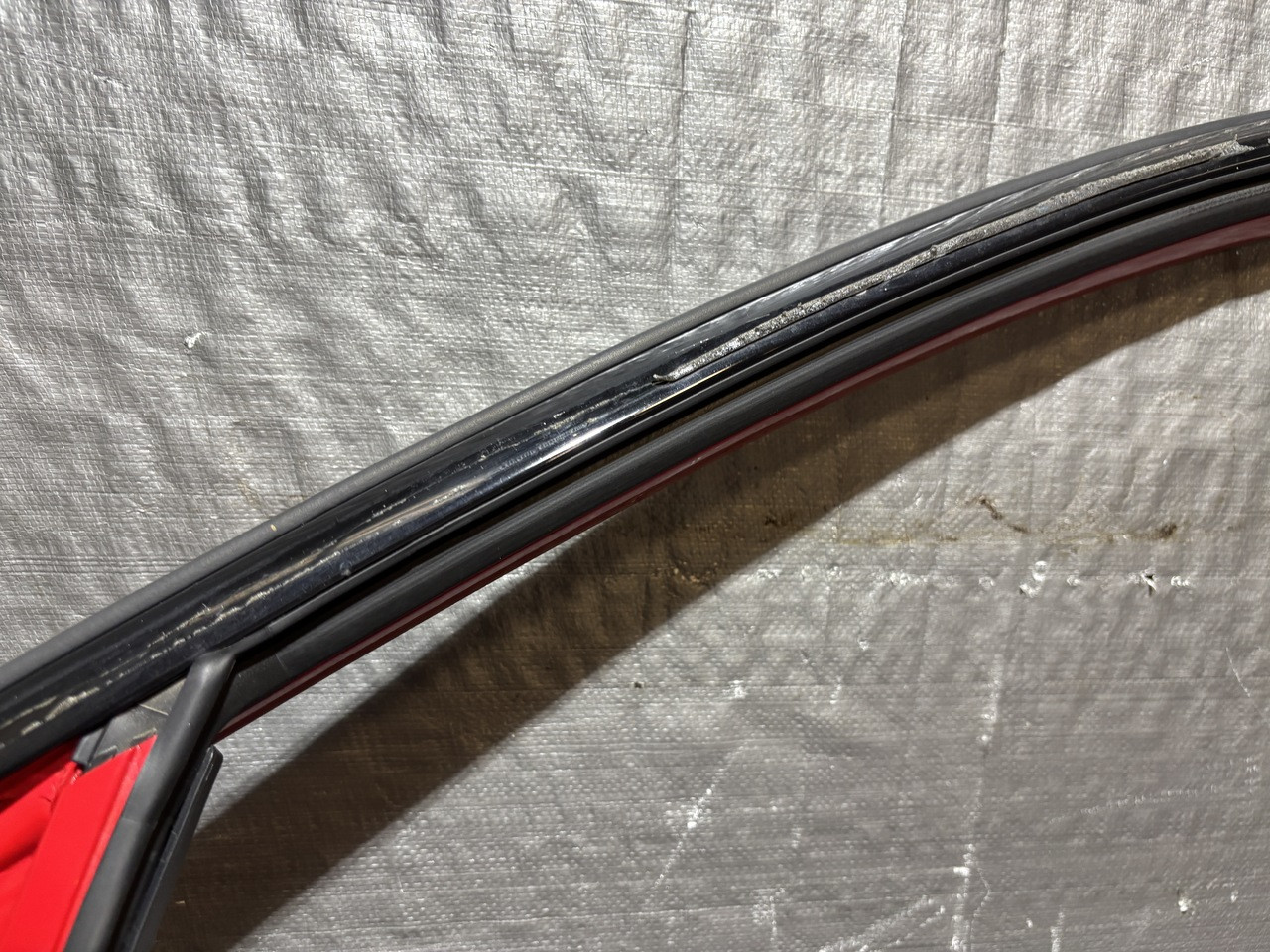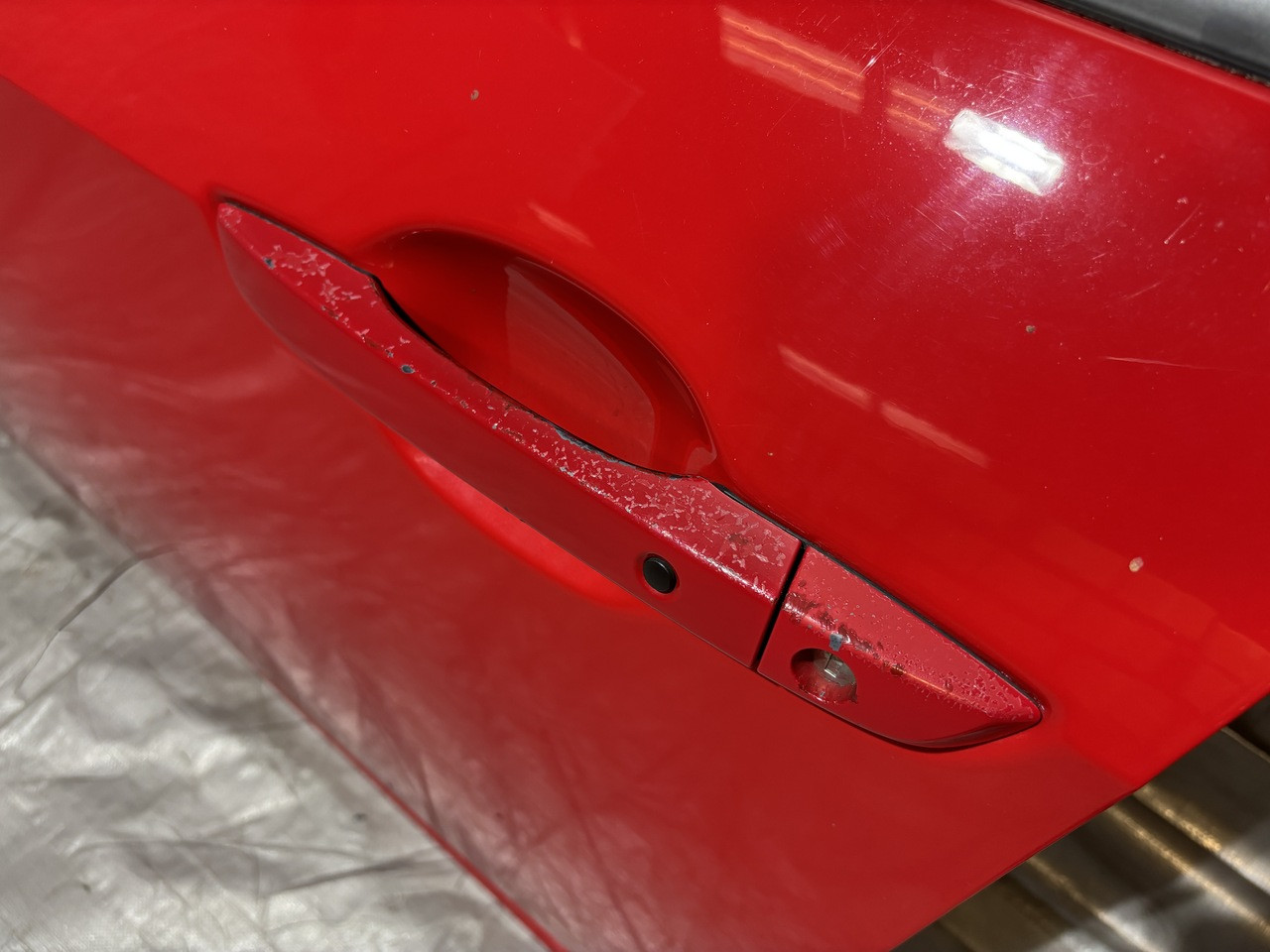 In typical used cosmetic condition with no deep scratches or major fading in the finish. The door frame has some heavier adhesive residue leftover from previously installed vent visors. There is some chips and scratches in the finish, some of which are poorly touched up. There are a few light scratches and swirls in the finish which may not be directly visible in the photos. The paint finish on the exterior door handle has heavier sun damage and bubbling in the finish as shown.