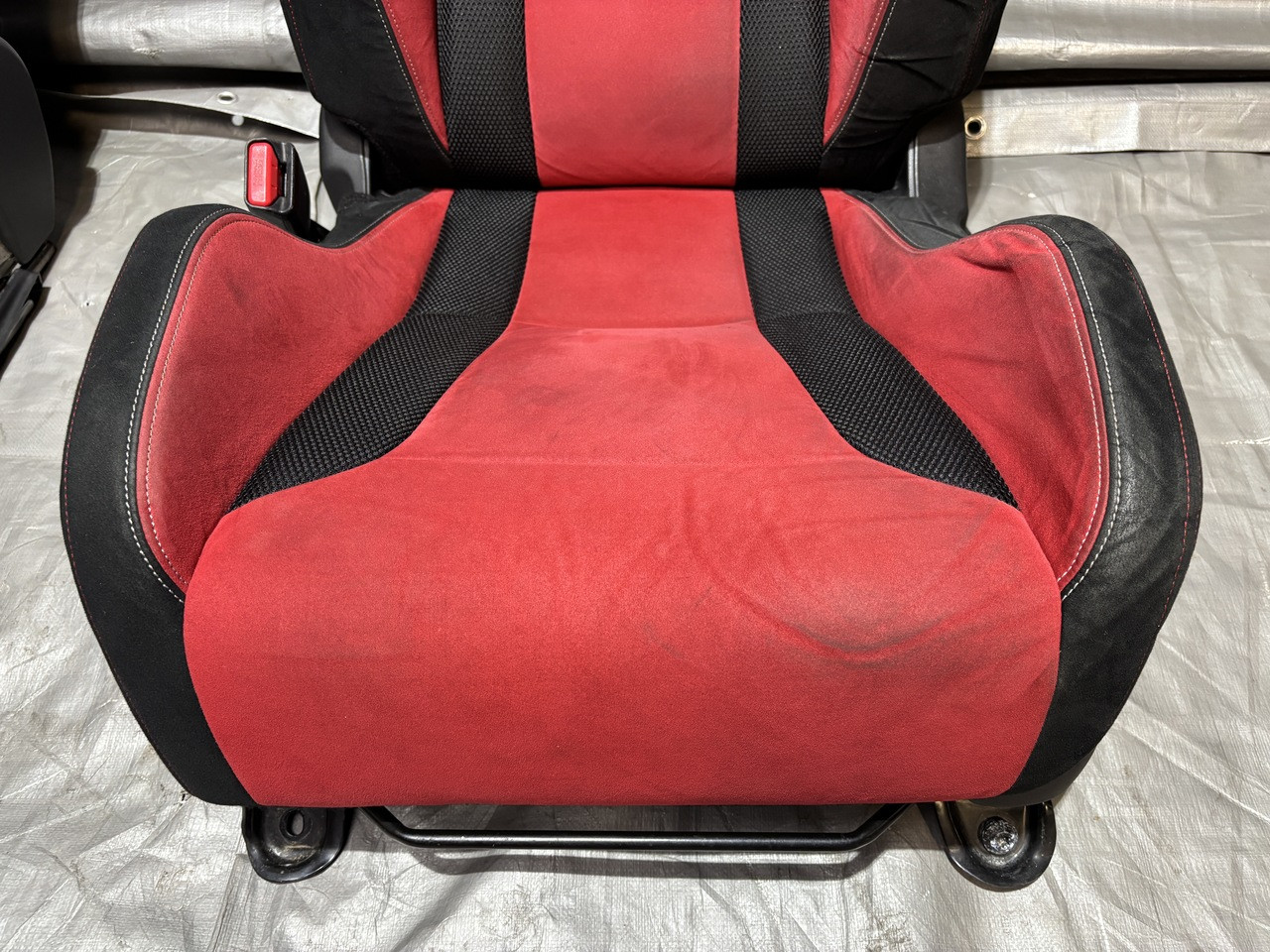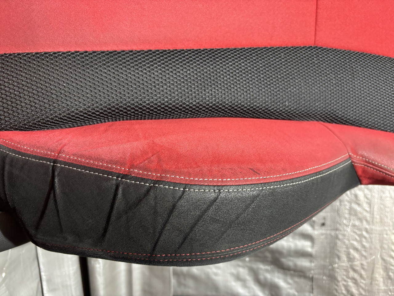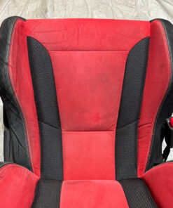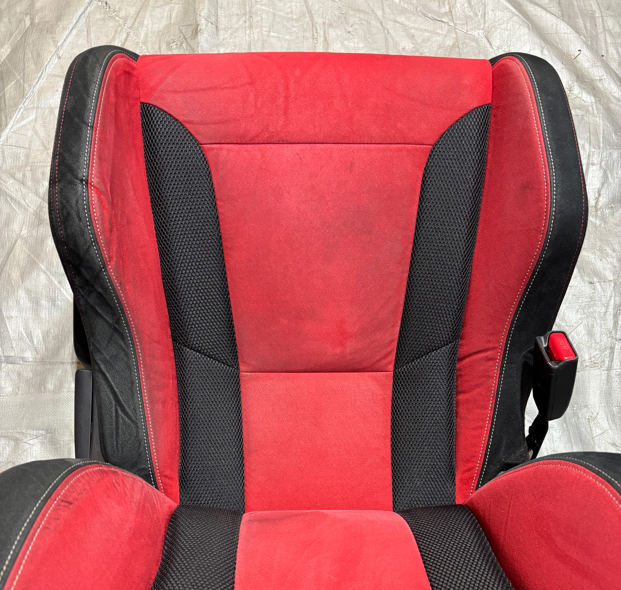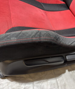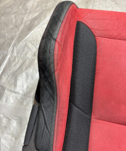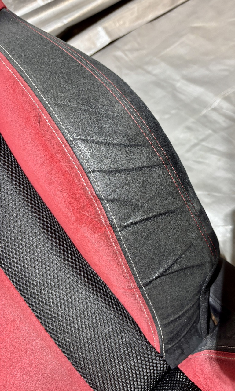 In fair overall cosmetic condition. The red suede on the driver seat has some visible staining and discoloration as shown. The lower bolster has some visible wrinkling and crease marks from use.