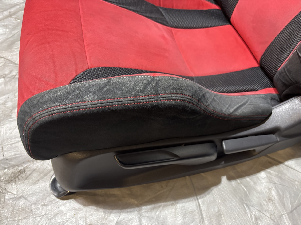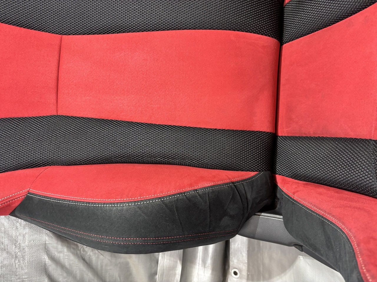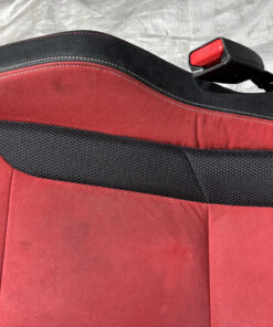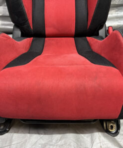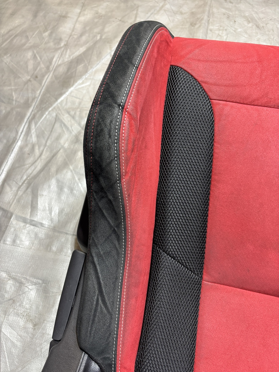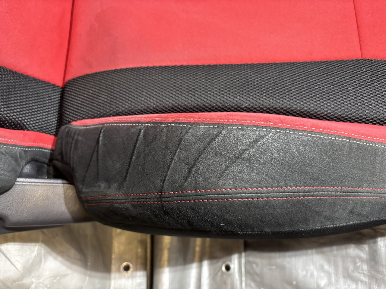 In fair overall cosmetic condition. The red suede on the driver seat has some visible staining and discoloration as shown. The lower bolster has some visible wrinkling and crease marks from use.