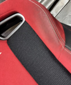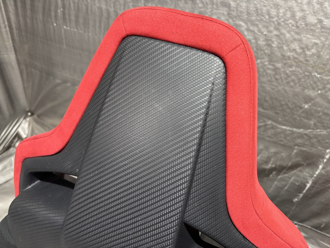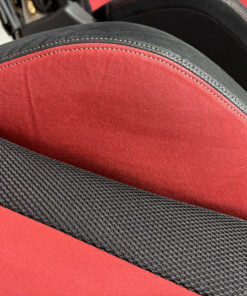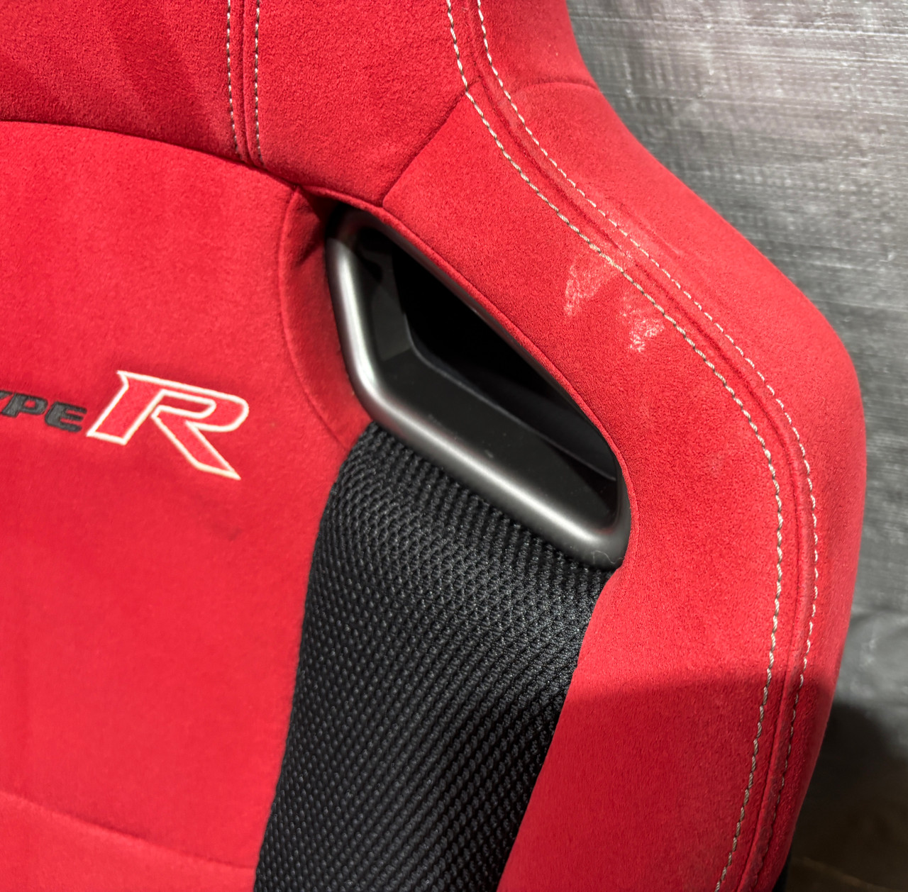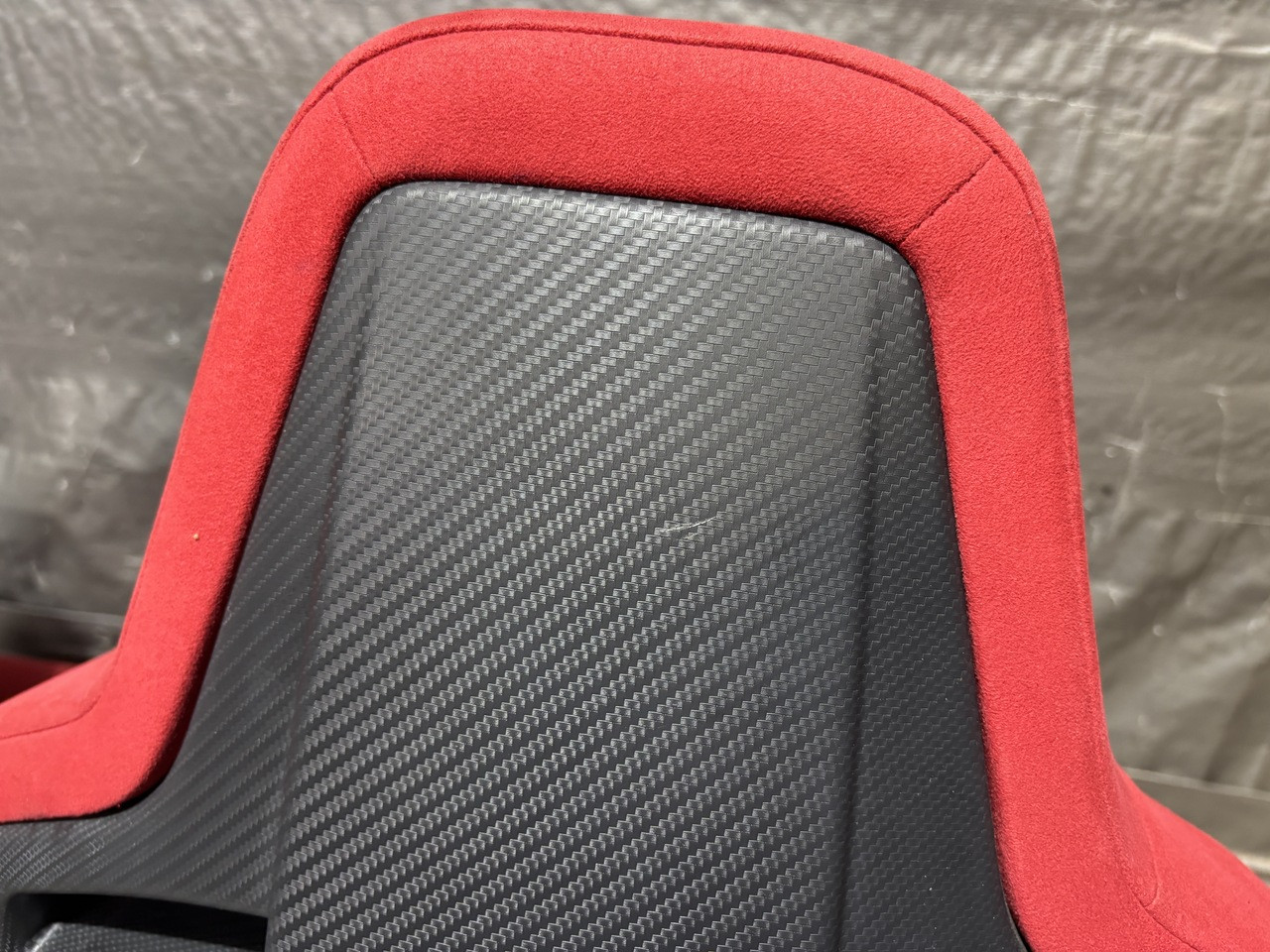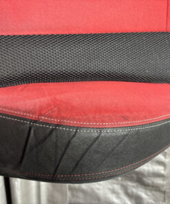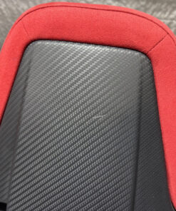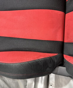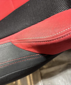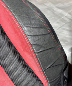 In fair overall cosmetic condition. The red suede on the driver seat has some visible staining and discoloration as shown. The lower bolster has some visible wrinkling and crease marks from use.