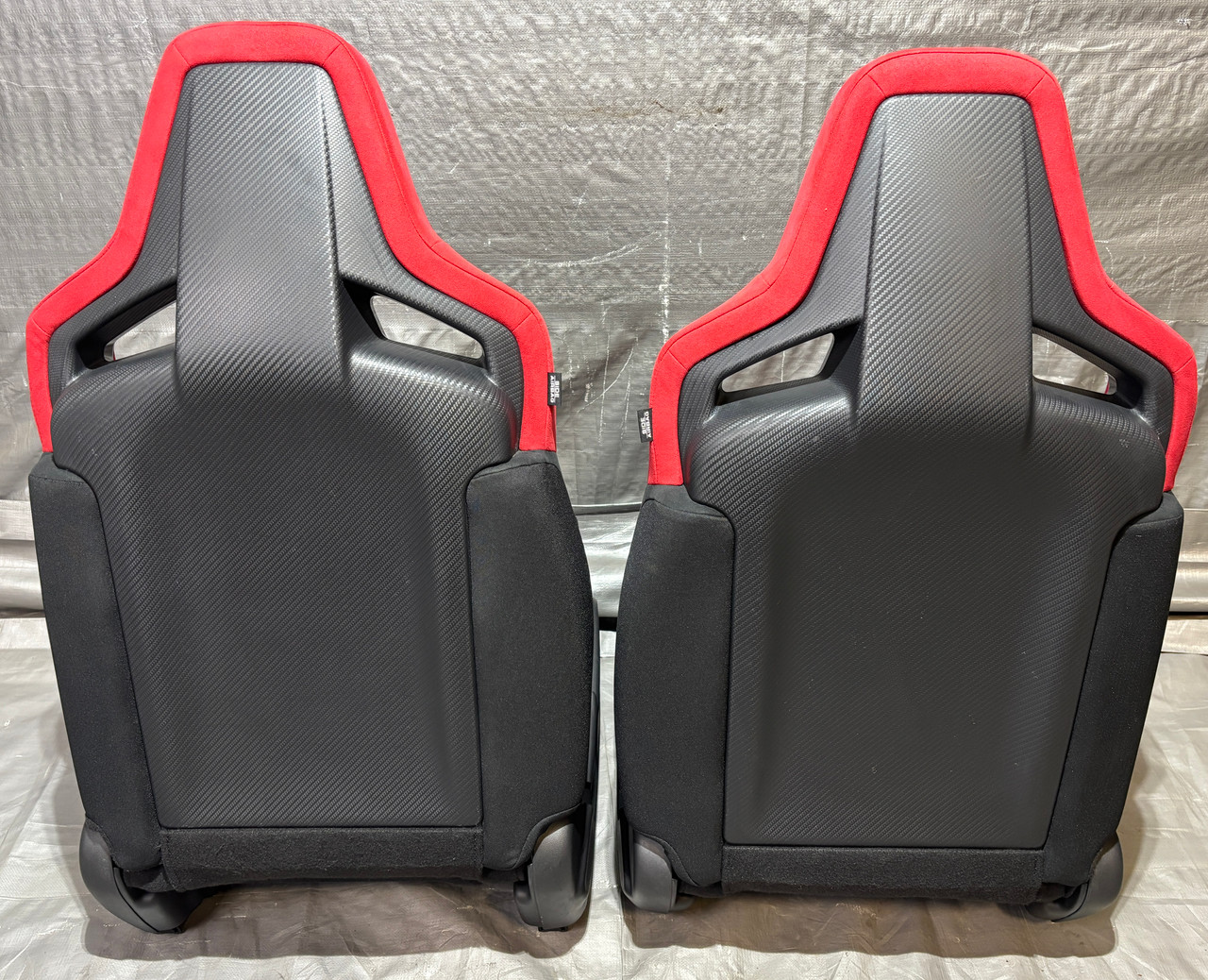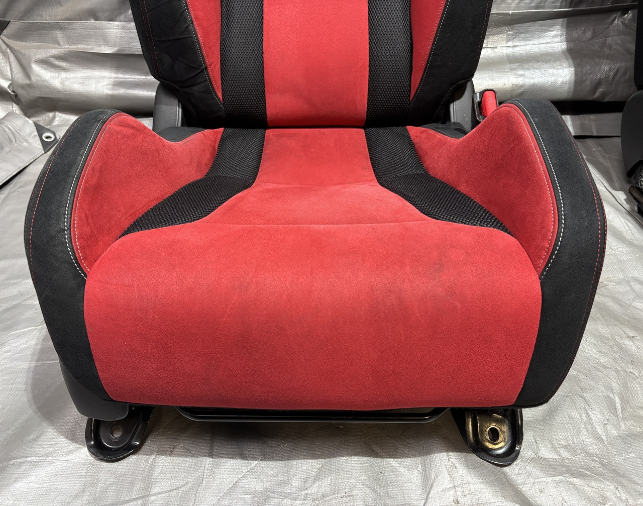 Includes both the driver and passenger seat assemblies. Red suede seat covers are free of any major rips or tears in the material, and the stitching is fully intact. Includes everything as shown, you may need to reuse some of your existing hardware for installation.